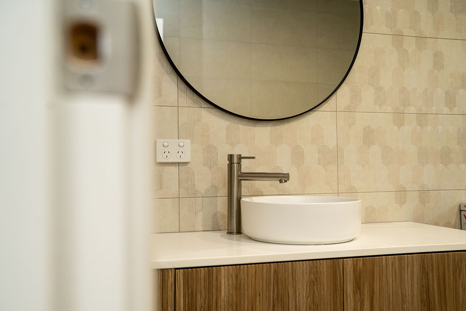 Landscaping included cost-effective loose stone, a paved stepping path, and a stepped retaining wall to elevate the backyard play area. Despite the challenges of a sloping block, clever level transitions and careful ceiling planning ensured clear sightlines from the kitchen to the rear fence.